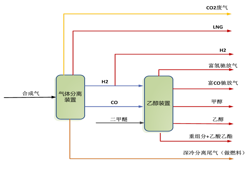該項目主要產(chǎn)品乙醇、甲醇、氫氣、LNG、重組分及乙酸乙酯。項目擬采用合成氣和二甲醚為原料:外來合成氣經(jīng)MDEA脫碳后,進入氣體分離裝置,氣體分離裝置采用深冷分離+PSA工藝路線生產(chǎn)H2、CO,同時副產(chǎn)LNG及深冷分離尾氣(做燃料)。外來二甲醚與CO、H2進乙醇裝置生產(chǎn)乙醇產(chǎn)品,同時副產(chǎn)甲醇、重組分及乙酸乙酯產(chǎn)品。