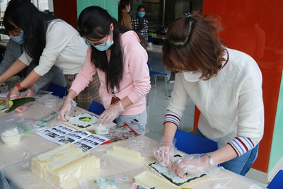 在這個屬于“女神”的節日里,工會組織女職工進行了一場愜意又休閑的手工制作活動。工作人員將事先準備好的制作壽司、雪媚娘等食品所需要的原材料在職工食堂擺放整齊,讓大家親自動手進行制作。制作過程中,大家親密交談,協同制作,在忙碌的工作之余度過了一段難忘的午后時光。