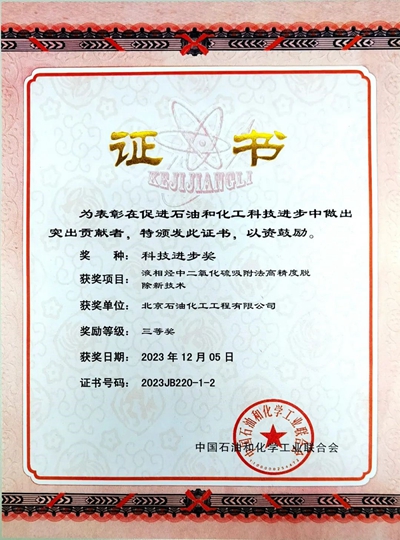 近日,中國石油和化學(xué)工業(yè)聯(lián)合會公示了《2023年度科學(xué)技術(shù)獎》獲獎成果,北京石油化工工程有限公司“液相烴中二氧化硫吸附法高精度脫除新技術(shù)”榮獲2023年度中國石油和化學(xué)工業(yè)聯(lián)合會科技進(jìn)步獎三等獎。