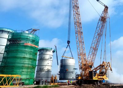 目前,DMC裝置主框架鋼結構開始安裝,同時一塔、三塔下段裙座已吊裝就位。兩塔直徑均為8米,高度分別為66.08米和66.7米,重量為455噸和411噸,此次吊裝采用600噸履帶吊,分四段制造及四段吊裝。  為確保順利吊裝,業主、監理、總包、施工單位召開多次吊裝專題會,結合場地實際情況,研討制定吊裝方案,嚴格按照操作要求進行施工。在各方人員密切配合下,高質量完成了本次吊裝任務。