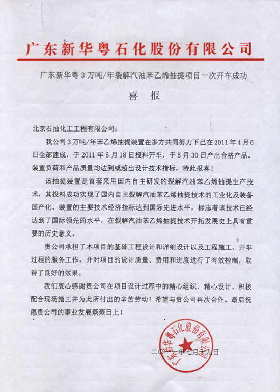 由我公司負(fù)責(zé)設(shè)計(jì)的廣東新華粵3萬噸/年裂解汽油苯乙烯抽提項(xiàng)目于2011年5月18日投料開車,并于5月30日產(chǎn)出合格產(chǎn)品。目前,裝置負(fù)荷和產(chǎn)品質(zhì)量均達(dá)到或超過設(shè)計(jì)技術(shù)指標(biāo)。為此,業(yè)主單位廣東新華粵石化股份有限公司特向我公司發(fā)來喜報(bào)。