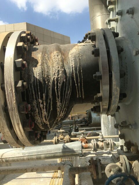 偏心和同心橡膠接頭皆為三元乙丙橡膠生產(chǎn),耐壓20公斤,316L不銹鋼法蘭,用戶使用的環(huán)境為化工行業(yè),水樣催化劑的介質(zhì),常理來說,這類介質(zhì),對橡膠球體本身并不會造成什么影響,為什么橡膠接頭會開裂呢?通過圖片情況我們可以看到,橡膠球體外部膠層開裂內(nèi)部并無泄露現(xiàn)象,這種情況一般是由于壓力過大導致的,但用戶水泵打開壓力又并未超出橡膠接頭承受壓力范圍,所以這一情況進行排除,第二種原因就是由于生產(chǎn)問題,內(nèi)外膠層貼合不嚴密的情況下,由于溫度影響造成內(nèi)外膠層分離,進而橡膠接頭承壓能力減弱,在運行過程中容易造成開裂。